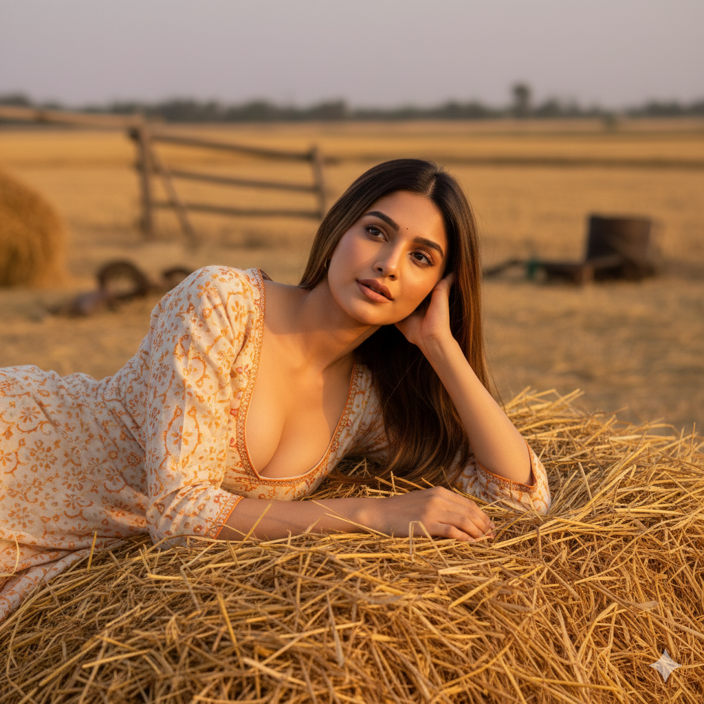 A hyper-realistic cinematic portrait of a young Indian rural woman lying gracefully on a heap of golden wheat straw (bhusa / harvested haystack) in a countryside farm setting. She is resting on her side, head supported by one hand, giving a calm, thoughtful, slightly dreamy expression. Her gaze is soft and natural, looking slightly off-camera. Wearing desi deep U salwar samij. Revealing upper bust