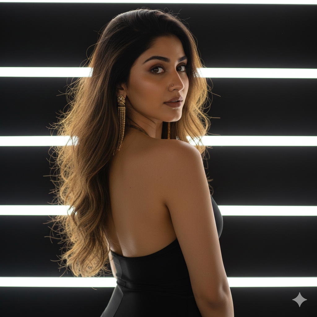 A highly detailed photorealistic image of Indian women in a studio setting with black background and horizontal white neon light strips. She is posing from the back, slightly turned to the side, looking over her left shoulder with a subtle serious expression, brown eyes gazing directly at the camera, light matte lipstick, small nose piercing on left nostril, long dangling gold earrings. Her long wavy dark brown hair cascades down her back.