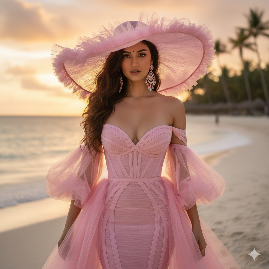 Edit the photo with a woman wearing a luxurious off-the-shoulder pink bandage gown. The sleeves are made of thick sheer puff pink tulle. The corset is textured with gathered and pleated pink fabric, and the neckline is deep and elegant. She wears a large wide-brim pink hat made of matching sheer pink fabric with lace edges. Her accessories include intricate dangling pink chandelier earrings with pale green or mint gemstones for subtle contrast.
