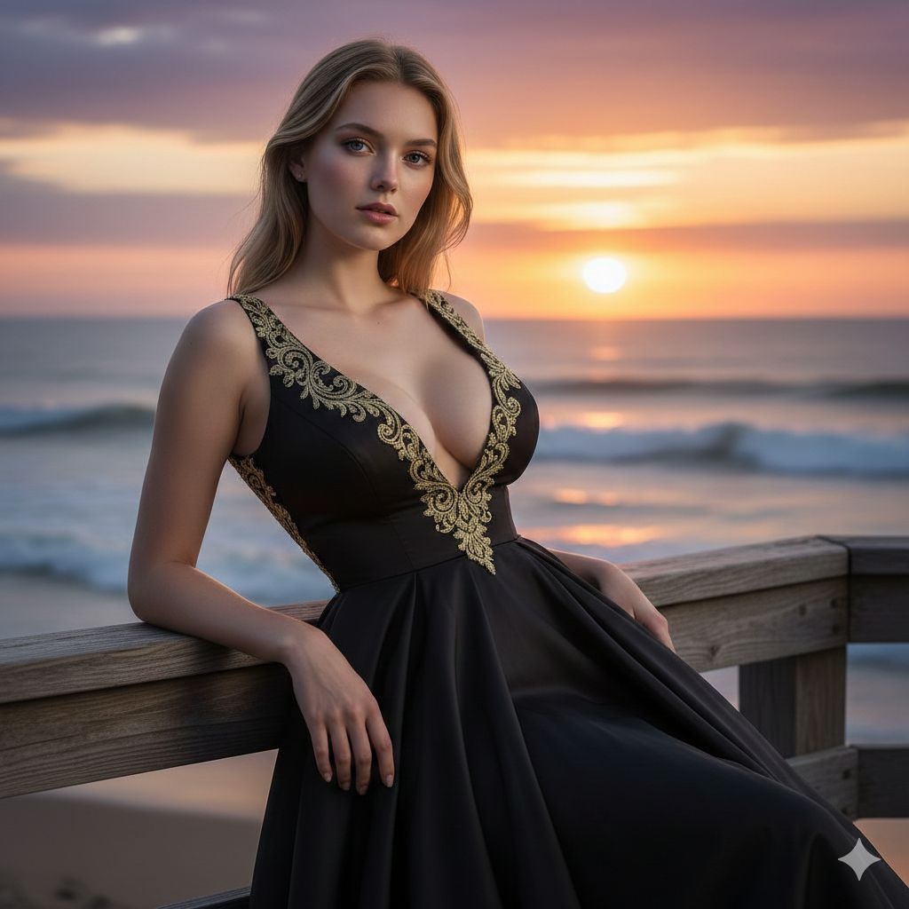 A cinematic fashion portrait of a beautiful young woman leaning back against a wooden seaside railing at sunset. She is wearing an elegant black sleeveless gown with deep neckline, slim physics and extra Large voluptuous bust,adorned with intricate gold ornamental detailing along the arround only neckline border. The dress flows gracefully, enhancing a luxurious and festive look. She has fair skin, soft nature