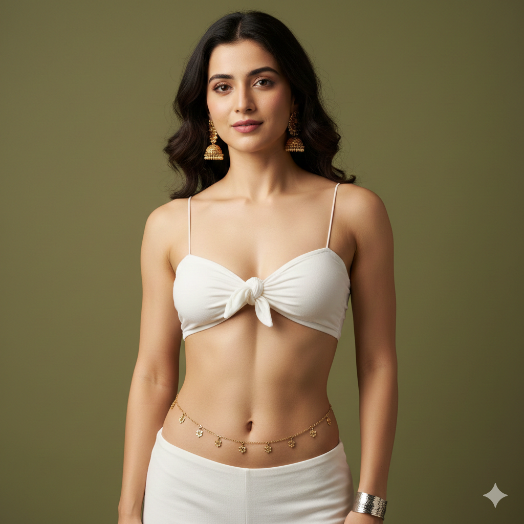 Generate a medium-shot portrait of a young woman with a fair complexion and face same as image uploaded, having slender, toned figure poses confidently against a plain, olive-green background. She wears a white, knotted bandeau top with thin spaghetti straps, paired with a low-rise white garment that emphasizes her exotic midriff on her voluptuous waist. Her accessories include a delicate gold waist chain adorned with floral charms, intricate traditional gold jhumka earrings, and a silver bangle
