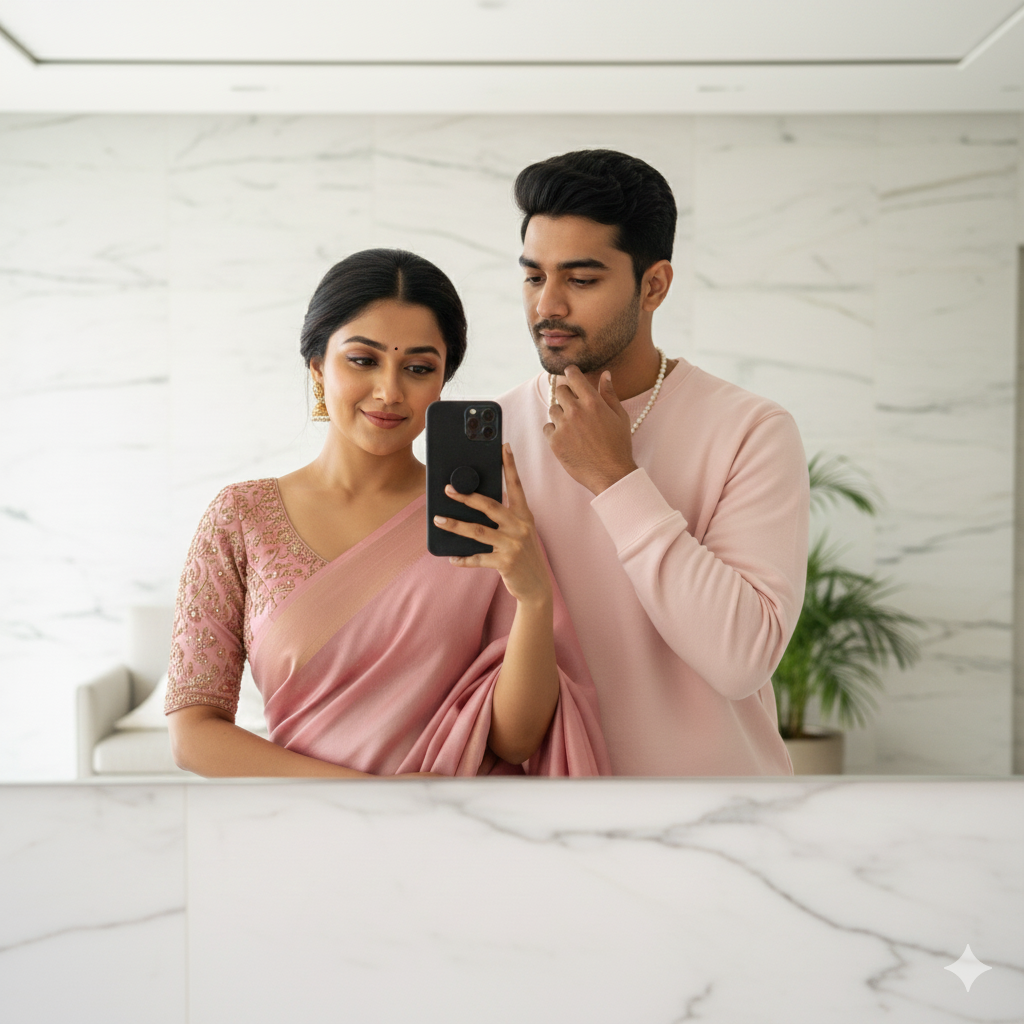 "A realistic mirror selfie of a young couple in a bright, modern room with white marble walls. The girl is in the foreground, wearing a beautiful dusty pink saree with an embroidered blouse, holding a black smartphone to take the selfie. The boy (from the second image) is standing slightly behind her, looking towards her and the camera. He is wearing a light pink sweatshirt and a pearl necklace, with one hand near his chin, posing naturally. The lighting is soft and natural, making the scene lo