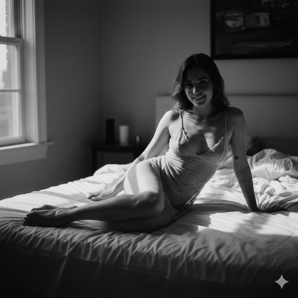 Whole body photo of a gorgeous lady wearing skimpy nighties on the bed, seductive smile, daytime, deep photography, Ilford HP5 film, b&w, crushed blacks, depth of field, dark photo, film grain, shadows, natural light