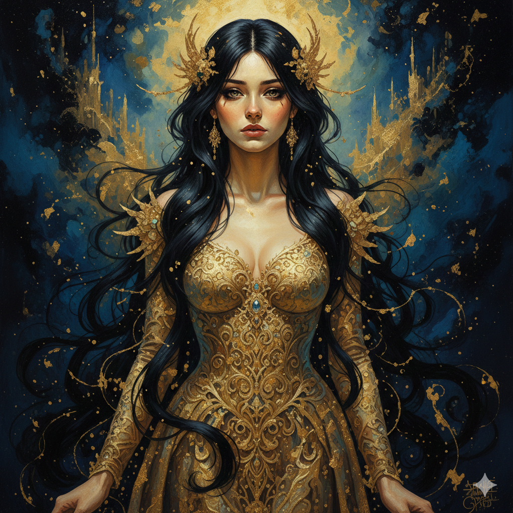a woman with long black hair in a gold painting, in the style of charlie bowater, dark blue and dark black, michael garmash, comic art, realistic color palette, dark black and beige, soft-focused realism --ar 24:37 --stylize 750 --v 6